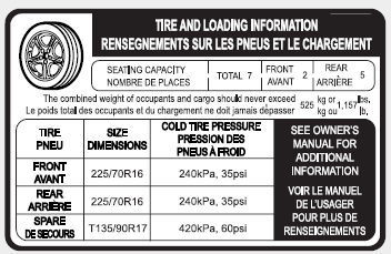 La pression de gonflage de tous les pneus (incluant la roue de secours) doit être vérifiée une fois par mois lorsque les pneus sont froids.